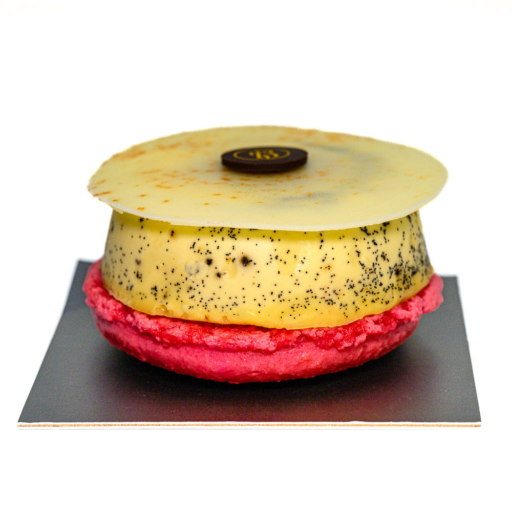 Macaron framboise - Crème brûlée vanille - Confit framboise.