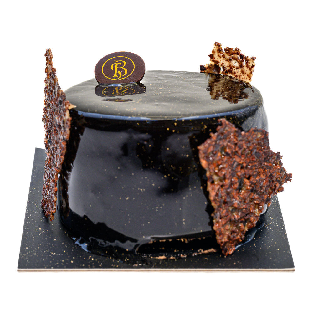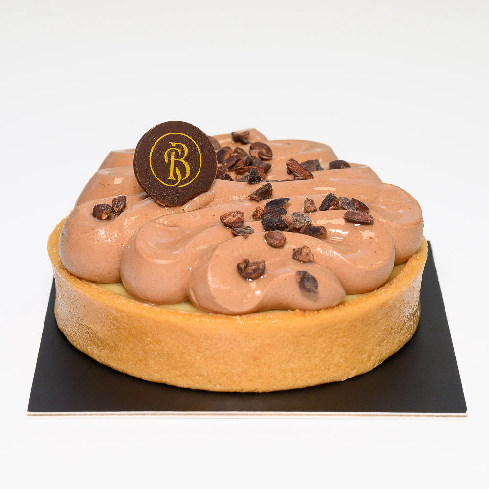 Mousse chocolat au lait 43%, crème brulée vanille, croustillant praliné, biscuit façon brownie.