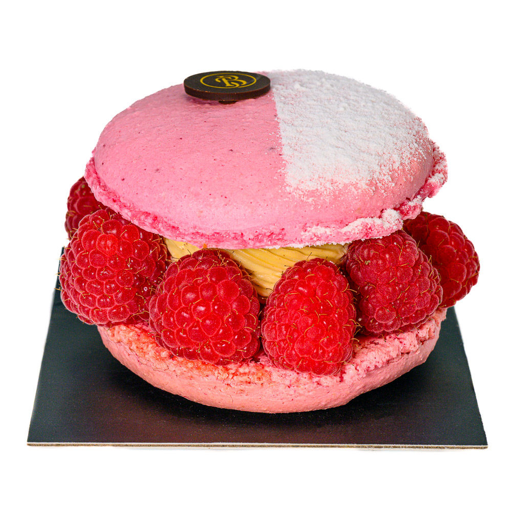 Macaron framboise - Ganache pistache - Confit framboise, framboises fraîches.