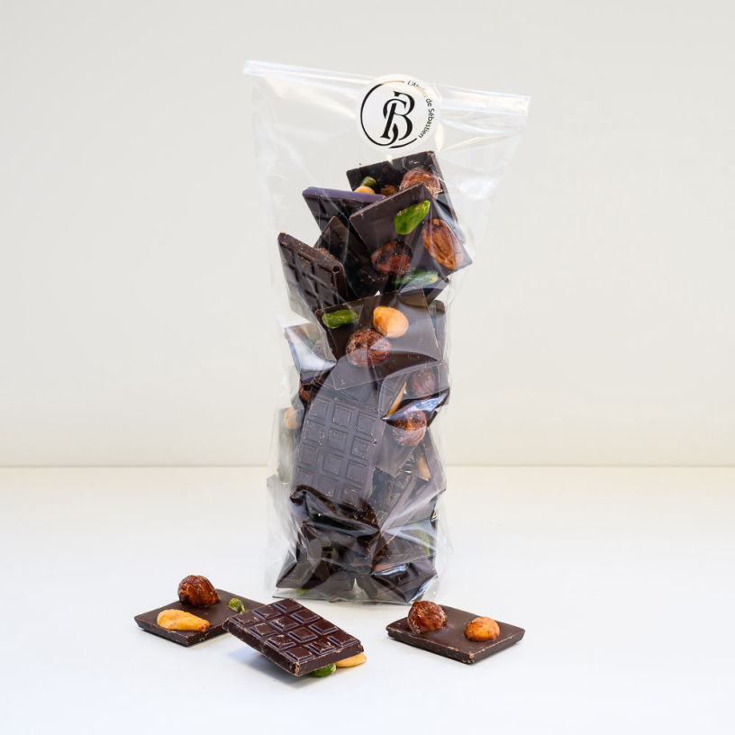 Ganache chocolat noir 68%, coque craquant au chocolat.