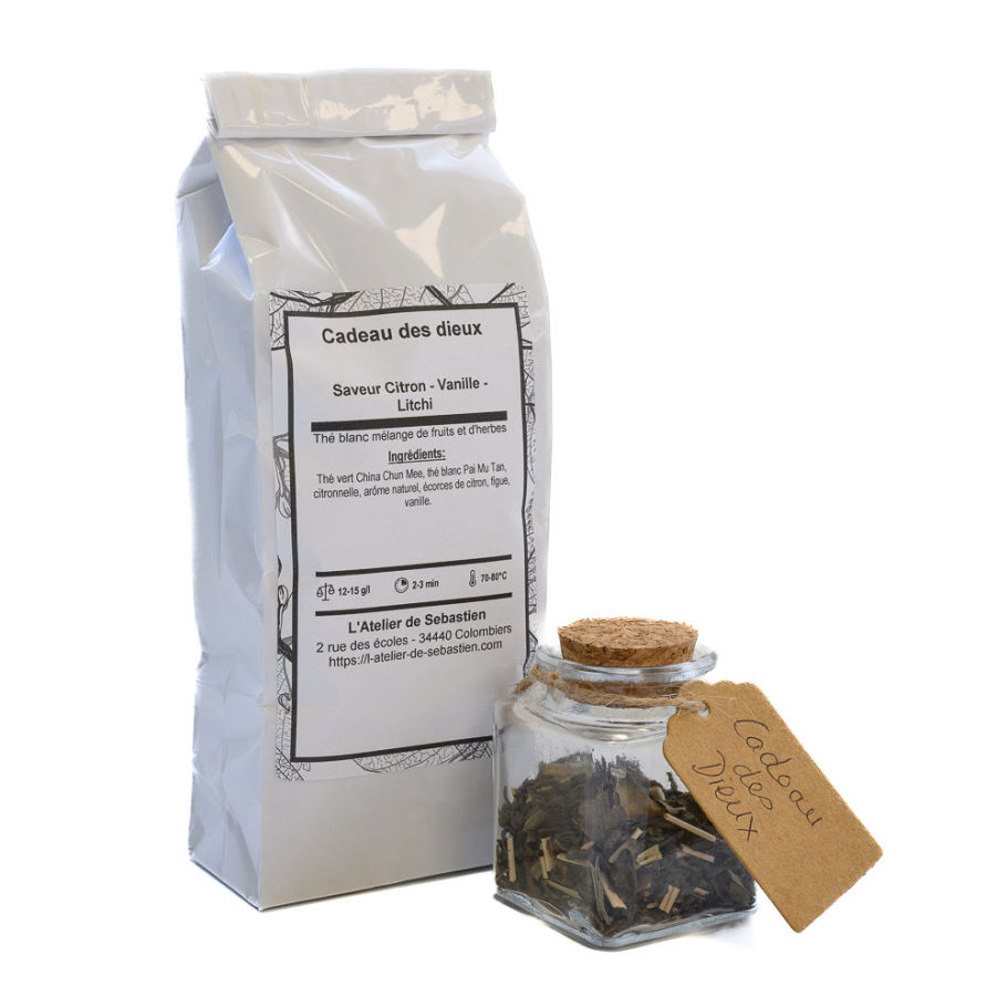Thé vert China Chun Mee, thé blanc Mu Tan, citronnelle, arôme naturel, écorses de citron, figue, vanille.